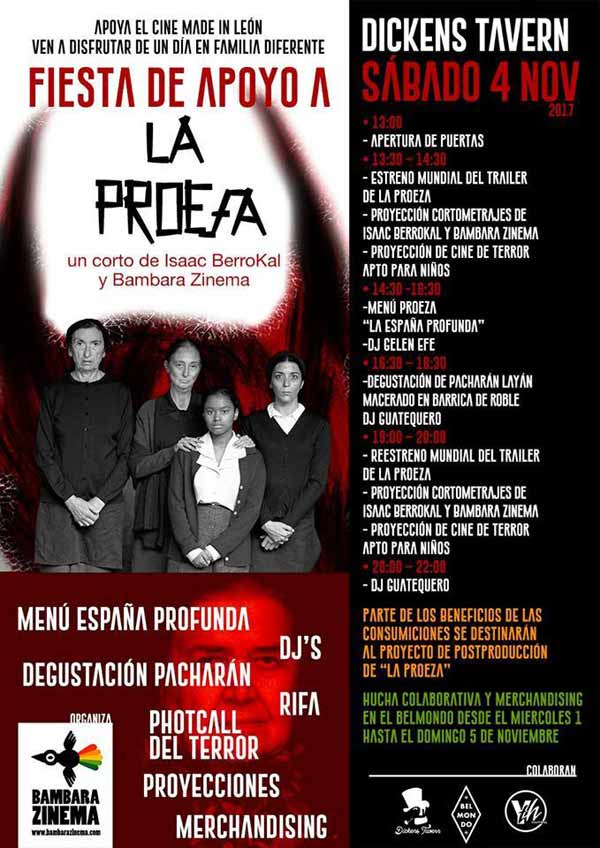 Este es el cartel que Cholo Roots AndFyah ha creado para el fiestón que tendrá lugar el próximo sábado 4 de noviembre en la Dickens Tavern, ubicada justo al lado de la Catedral leonesa, para buscar apoyos con el objetivo de finalizar la postproducción de «La Proeza», un cortometraje leonés con actores leoneses, dirigido por Isaac Berrokal y Bambara Zinema.