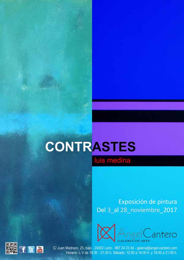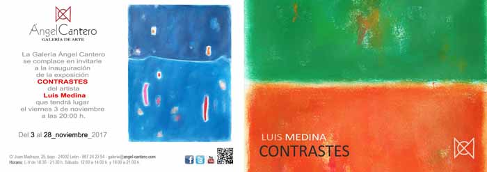 “Contrastes” es la segunda exposición de pintura del artista santanderino Luis Medina en la Galería Ángel Cantero; si bien en la anterior hablaba de “la forma del color”, ahora habla de su “contraste” en Texturas y Planos, las dos partes que configuran su exposición actual compuesta por unas treinta obras en acrílico sobre lienzo o sobre papel, correspondientes a la obra más reciente.