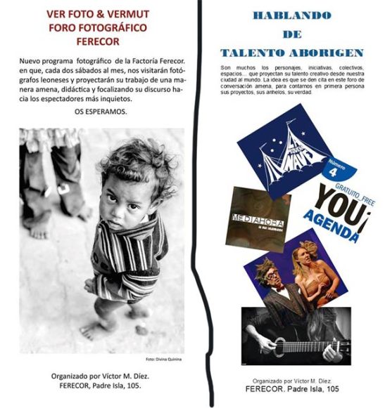 De la mano del poeta Víctor M. Díez llegan dos nuevos ciclos al bar cultural FERECOR, en León, con voluntad de prolongarse en el tiempo. Dos sábados al mes, a la hora del vermut (a mediodía), habrá proyecciones de distintos fotógrafos leoneses, que hablarán de su trabajo con los asistentes. Y dos miércoles al mes, por la tarde, distintos talentos creativos charlarán sobre sus proyectos. Los fotógrafos Juan Luis García, Divina Quinina e Isabel Medarde, por un lado, y los artistas circenses de La pequeña Victoria Cen, la cantante Isamil9, el cineasta Epigmenio Rodríguez y los actores Inés Diago y Alberto Díaz serán los primeros en desfilar por ambos ciclos.