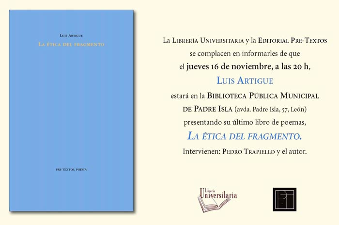 El pasado mes de octubre llegó a las librerías «La ética del fragmento» (Pre-Textos), el último libro de del poeta y novelista leonés Luis Artigue. Este jueves 16 de noviembre el poemario se presenta en la buhardilla de la Biblioteca Pública Municipal de Padre Isla (C/ Padre Isla 57, frente a la iglesia de Renueva, en León). Será a las 20 horas y el autor estará acompañado por el periodista y escritor Pedro Trapiello. Entrada libre.