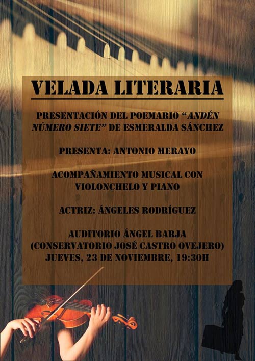 La poeta salmantina Esmeralda Sánchez Martín presenta en León este jueves 23 de noviembre, a las 19.30 horas, su libro ‘Andén número siete’, una recopilación de poemas inéditos que ha escrito en los últimos años. El acto tendrá lugar en el Auditorio Ángel Barja (entre el Conservatorio y el edificio de Correos), y la autora estará acompañada por el poeta Antonio Merayo y la actriz Ángeles Rodríguez. Habrá acompañamiento musical, con violonchelo y piano.