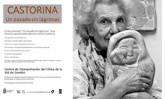 El Centro de Interpretación del Clima de la localidad leonesa de La Vid de Gordón acogerá este sábado 9 de diciembre, a las 17,30 horas, la proyección del documental «Un pasado sin lágrimas» (2014), en el que los realizadores Amando Casado y Jesús Palmero ofrecen una mirada apasionada sobre la escultora Castorina. Tras la proyección, la escultora mantendrá un coloquio con los asistentes. Este acto, que quiere ser también un pequeño homenaje a la creadora afincada en Astorga, está vinculado a la exposición colectiva “Estratos fracturados”, en la que se pueden ver más de un centenar de obras de artistas leoneses o vinculados a León, y que estará abierta al público hasta finales de enero de 2018. Entrada libre.