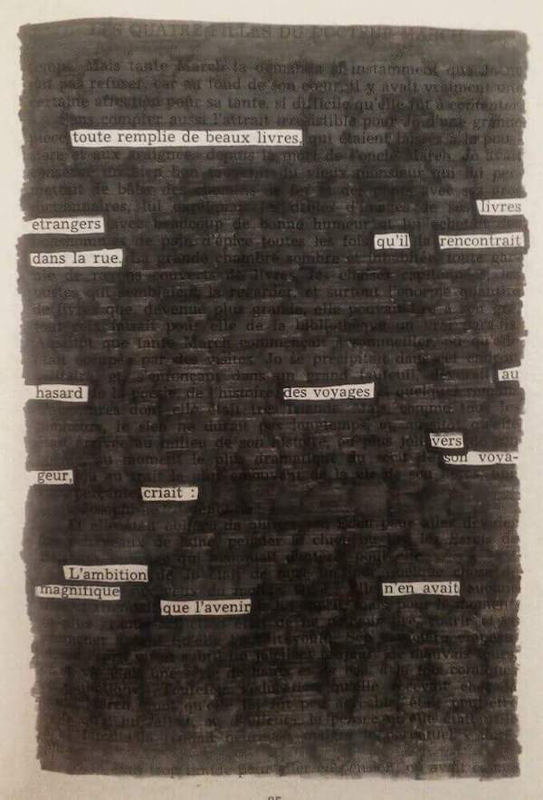 Continuamos con una nueva sección poética en TAM TAM PRESS de la mano de la joven poeta leonesa afincada en Francia Silvia Abad Montoliú, autora de «La noche que dejó de ser un animal». Bajo el título de «Poesía opaca» («blackout poetry» en inglés, «poèmes opaques» en francés…), la autora realiza un juego poético y visual de tachaduras sobre una página escrita, buscando un poema escondido a la vista. «Je joue, donc j’écris»…