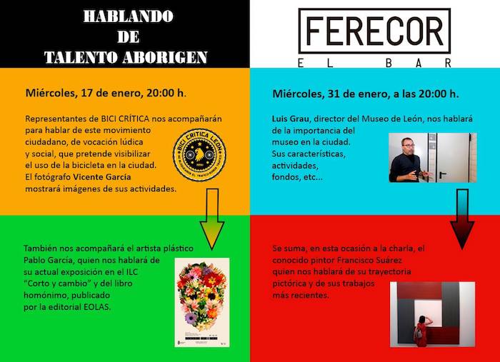 Con el nuevo año, el bar cultural leonés FERECOR retoma este miércoles 17 de enero el ciclo «Hablando de talento aborigen», que busca dar visibilidad a personajes, colectivos, iniciativas… muchas veces desconocidos, pero que bullen en la ciudad. Este miércoles la cita será con representantes del colectivo BICI CRÍTICA y con el artista plástico Pablo García (Pablo Je Je). Y continuarán celebrándose también, dos sábados al mes, las sesiones del foro «Ver Foto & Vermut», por el que desfilarán interesantes fotógrafos leoneses para mostrar sus obras y hablar de su trabajo.