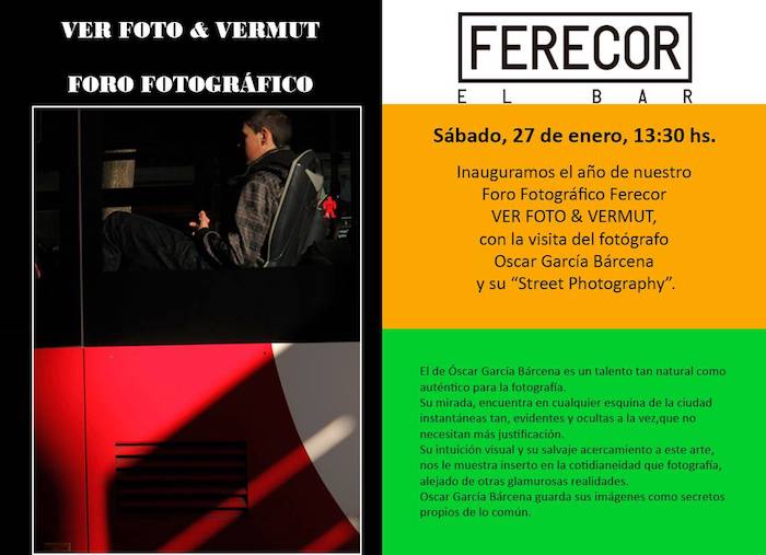 - El fotógrafo Óscar García2 Barcena y su serie ‘Street Photography’ abrirá este año el Foro Fotográfico Ferecor «VER FOTO & VERMUT. Para el coordinador del ciclo, se trata de un fotógrafo «con un talento natural y auténtico, que encuentra en los alrededores del barrio de San Claudio instantáneas tan curiosas e inquietantes que no necesitan más justificación. Su intuición visual y su salvaje acercamiento a este arte le inscriben en la pura cotidianeidad que fotografía, alejado de otras glamurosas realidades. Óscar García Bárcena guarda sus imágenes como secretos propios de lo común».
