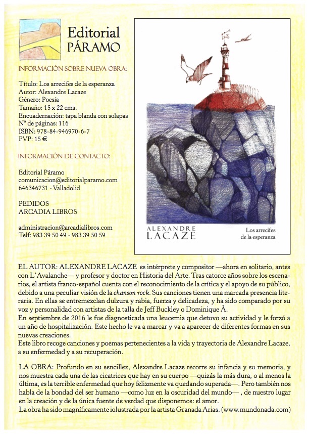 El bar Belmondo·La Buscona (C/ San Lorenzo 1, en León) acoge el viernes 2 de febrero, a partir de las 22 horas, la presentación de «Los arrecifes de la esperanza», el primer poemario del cantautor franco-español Alexandre Lacaze, publicado por Editorial Páramo (el sello de Javier Campelo). La presentación estará acompañada de un pequeño acústico ofrecido por Alexandre y la entrada es gratuita.