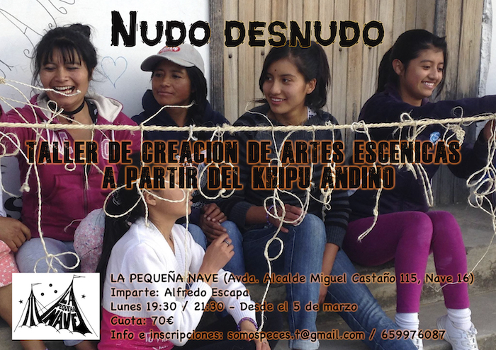 Y desde Ecuador llega la propuesta del leonés Alfredo Escapa Presa que tras su residencia de creación artística en el país americano, desarrollará un taller de creación escénica contemporánea a partir del Khipu, una herramienta cultural andina con los nudos como elemento central. El taller, con el nombre de «Nudo Desnudo» y dirigido a todos los públicos, tratará de que los participantes, a través de sus cuerpos, palabras e ideas, busquen nuevas formas de acercarse a sus creaciones, utilizando el conflicto como excusa para el juego. Como dice el propio Escapa “aunque la palabra conflicto suene algo difícil, en este taller intentaremos situarlo en un lugar menos complicado”. Será los lunes, empezando el 5 de marzo, de 19:30 a 21:30.