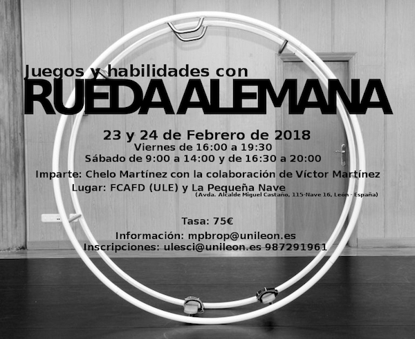 Desde la Universidad de Valencia llegará Consuelo Martínez que, en colaboración con la Universidad de León y su Área de Actividades Culturales, ofrecerá un taller centrado en la técnica de la Rueda Alemana, y la investigación en torno a este desconocido elemento (tan popular, sin embargo, en Alemania, de ahí su nombre) con el apoyo de Víctor Martínez. Será también en febrero, el viernes día 23 de 16:00 a 19:30 y el sábado día 24 de 9:00 a 14:00 y de 16:30 a 20:00.