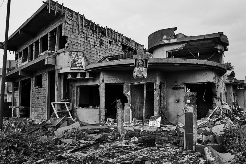 Calles desiertas y un silencio sepulcral reciben al visitante en la ciudad de Qaraqosh. Situada en el norte de Irak, a 30 kilómetros de Mosul, esta población de 50.000 habitantes fue considerada antiguamente la capital del cristianismo iraquí. Hoy esta vacía. Todas las casas han sido destruidas, saqueadas o quemadas. Las iglesias están arrasadas y las tumbas del cementerio profanadas.