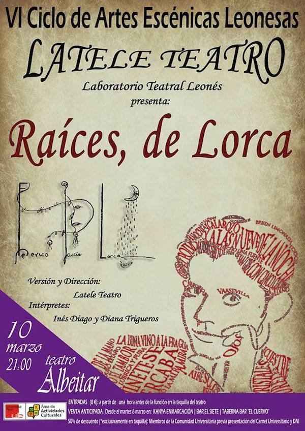 raices de lorca 5 de marzo de 2018 Return to: Inés Diago y Diana Trigueros estrenan en el teatro El Albéitar el espectáculo musical «Raíces, de Lorca»Máxima resolución (600 × 848) Image navigation Previous Image El cartel.