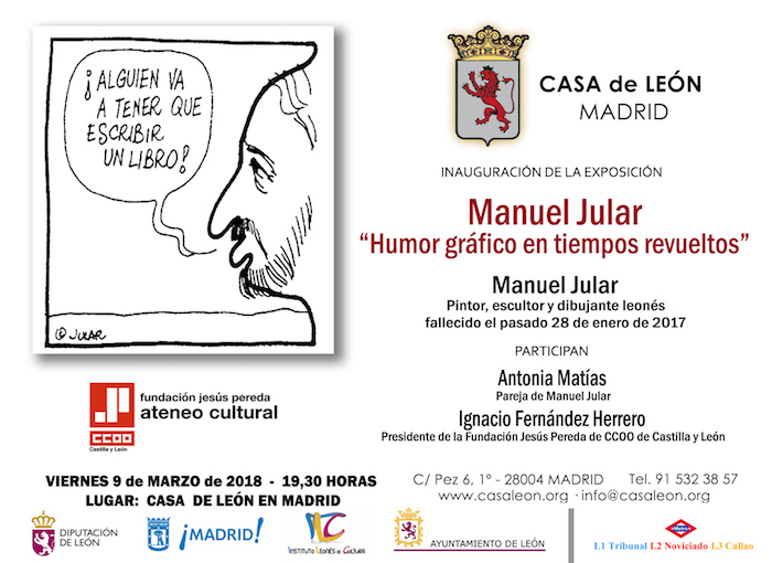 Este viernes 9 de marzo, a las 19’30 horas, se abre al público en la Casa de León en Madrid (en la calle del Pez, 6) la exposición “Manuel Jular. Humor gráfico en tiempos revueltos”, que podrá visitarse durante el mes de marzo, en horario de 12 a 20 horas. En la presentación estarán su compañera Antonía Matías Flecha, y el presidente de la Fundación Jesús Pereda, Ignacio Fernández Herrero. Y sí, como dice la viñeta que ilustra el cartel de esta muestra, alguien tendría que escribir un libro sobre este gran artista leonés fallecido hace poco más de un año.