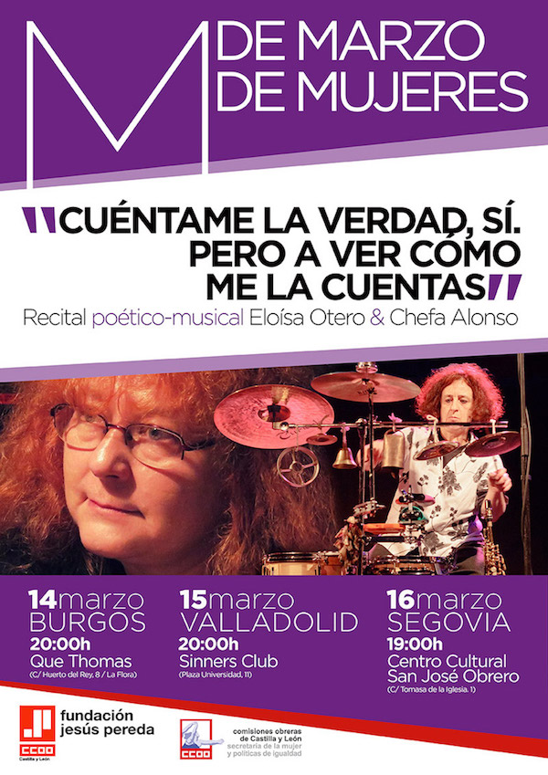 “Cuéntame la verdad, sí. Pero a ver cómo me la cuentas”. Así se titula el recital poético musical a cargo de dos mujeres comprometidas con la creación contemporánea: la saxofonista y percusionista gallega Chefa Alonso y la poeta leonesa Eloísa Otero. El espectáculo se pondrá en escena el miércoles 14 de marzo en Burgos (Que Thomas), el jueves 15 de marzo en Valladolid (Sinners Club), y el viernes 16 de marzo en Segovia (Centro Cultural San José Obrero). Entrada libre.