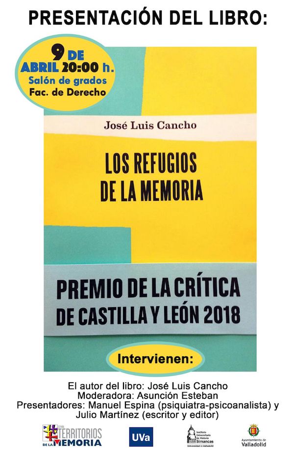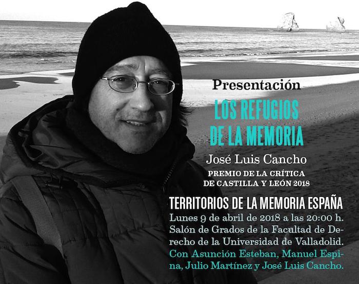 El escritor José Luis Cancho presenta este lunes, 9 de abril, en Valladolid, el libro autobiográfico con el que ha obtenido el Premio de la Crítica de Castilla y León 2018, «Los refugios de la memoria» (Papeles Mínimos). Y lo presenta en la Facultad de Derecho de la Universidad de Valladolid, donde en los años 70 asistió, como él recuerda, «a más asambleas que a clases». En el acto estará acompañado por el psiquiatra Manuel Espina, el escritor y editor Julio Martínez, y Asunción Esteban como moderadora.