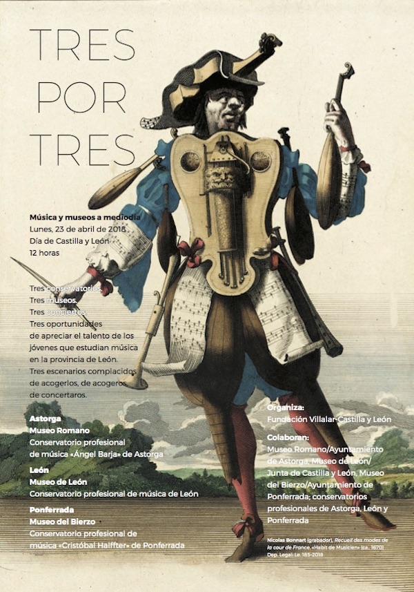 Este lunes, 23 de abril de 2018, se celebra el Día de Castilla y León, pero también el Día del Libro y de los Derechos de Autor. En la provincia de León, tres museos de tres ciudades se colmarán de música para deleitar los oídos de quienes se acerquen a apreciarla en esta jornada festiva, a partir de las 12 horas. La actividad se titula: «Tres conservatorios. Tres museos. Tres conciertos». Tres oportunidades de apreciar el talento de los jóvenes leoneses que estudian música en la provincia. Y tres escenarios complacidos de acogerlos: El Museo Romano (Astorga), el Museo de León (León) y el Museo del Bierzo (Ponferrada). Entrada libre.