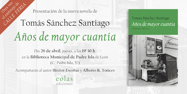 El poeta y novelista Tomás Sánchez Santiago presenta su nueva novela, Años de mayor cuantía (Eolas Ed.), este jueves 26 de abril en la Biblioteca Padre Isla (León). Será a partir de las 19.30 horas, y el autor estará acompañado por el escritor Alberto Rodríguez Torices y por el editor Héctor Escobar.