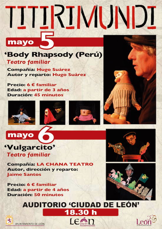 El Auditorio de León acoge este fin de semana, sábado 5 y domingo 6 de mayo, a las 18:30 horas, dos espectáculos enmarcados en el Festival de Titirimundi que, desde Segovia, extiende su programación por distintas localidades de Castilla y León. El día 5 actuará en León el ilusionista y titiritero peruano Hugo Suárez, con la obra ‘Body Rhapsody’, y el domingo 6 será la compañía La Chana Teatro la encargada de poner en escena ‘Vulgarcito’. Las entradas cuestan 6 euros.