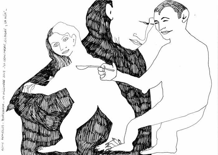 AUTORA_Reme Remedios_TITULO_La gran madre el padre y la hija_TEìCNICA rotulador sobre papel_ ANÞO 2017_ ESPACIO Dosmilvacas 3 de junio de 2018 Return to: «aguja tinta cerámica laurel», una colectiva de cuatro mujeres y más en la galería DosmilvacasMáxima resolución (700 × 496) Image navigation Previous Image Siguiente imagen Reme Remedios. "La gran madre el padre y la hija".