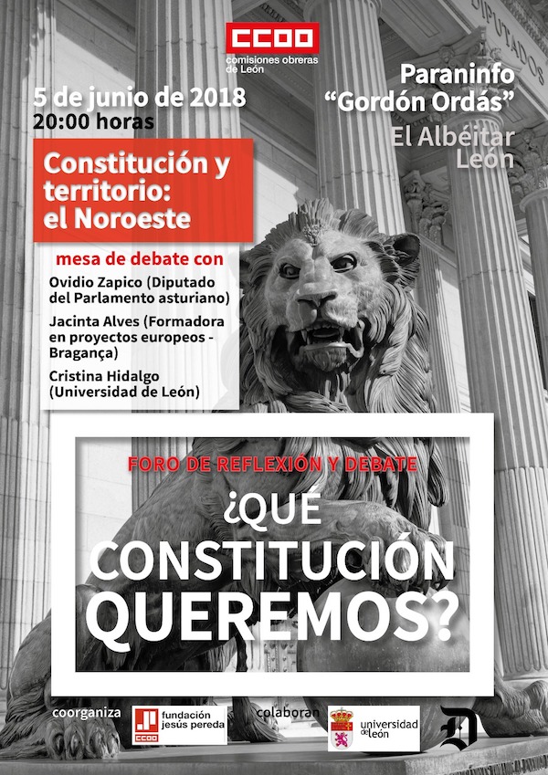 Este martes 5 de junio, dentro del ciclo “¿Qué Constitución queremos?”, tendrá lugar en León un debate sobre “Constitución y Territorio: el Noroeste”, en el que participarán el diputado asturiano Ovidio Zapico, la profesora portuguesa Jacinta Alves y la profesora universitaria leonesa Cristina Hidalgo, moderados por José Cortizo. Será en la sala Gordón Ordás (pabellón universitario El Albéitar), a las 20 horas. Entrada libre.