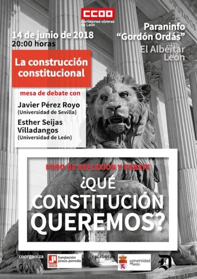 Dos reconocidos constitucionalistas, Javier Pérez Royo y Esther Seijas Villadangos, se encargarán de poner fin a un ciclo de reflexión y debate que se ha desarrollado desde el pasado mes de febrero, organizado por CCOO de León y la Fundación Jesús Pereda de CCOO de Castilla y León, en colaboración con la Universidad de León y el Diario de León. La cita es este jueves, 14 de junio, a las 20 horas, en la sala Gordón Ordás del edificio universitario El Albéitar (León).