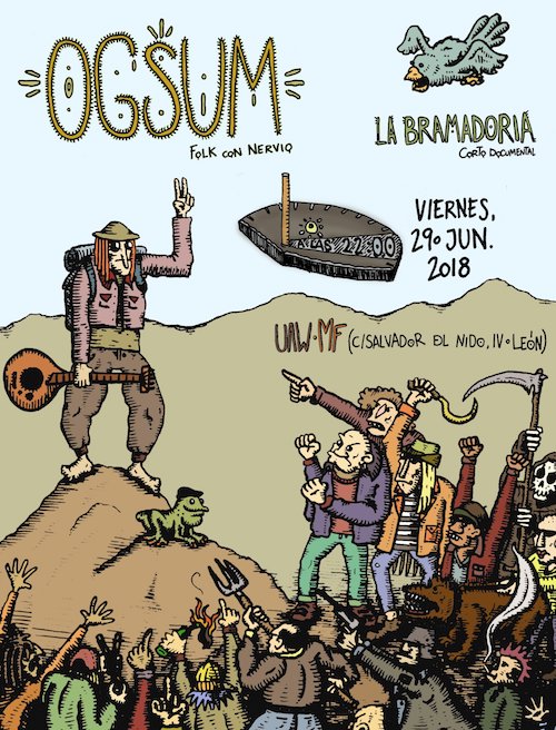 El grupo bilbaíno OGSUM estará en León el viernes 29 de junio de 2018, a partir de las 22 horas, en la sala UAW/MF (C/ Salvador del nido 4), donde los asistentes podrán disfrutar de su singular «folk con nervio» a través de canciones en asturiano y castellano con carácter libertario y ecologista; un folk crítico con nuestra sociedad actual que busca, también, recuperar la esencia de los sonidos ancestrales. Entrada gratuita con aportación voluntaria a la salida. Con este concierto se clausura la presente temporada de UAW/MF hasta próximo aviso.