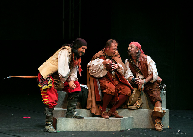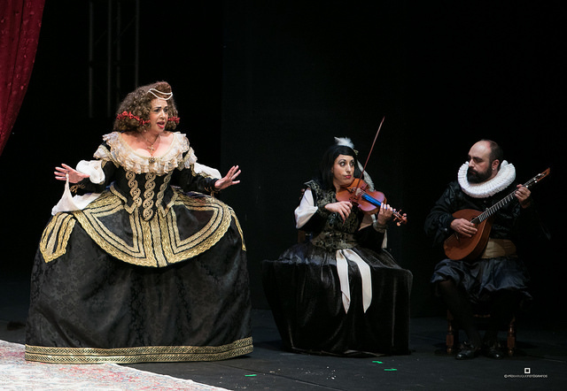 El actor que interpreta a Chichón, Eduardo Tovar, hace del verso traje. Es tan bello escucharle hacer con la prosodia todo tipo de virguerías que uno ve cómo las palabras toman forma. Eduardo recoge cada verso y con primor nos devuelve imágenes y sensaciones. Así que cuando el pillo borrachín es tentado con un odre con bebida, es a nosotros a quienes se nos llena la boca de vino.
