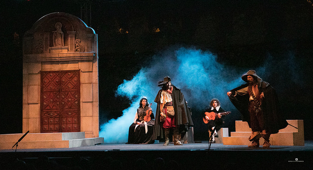 Morboria Teatro se yergue sobre el escenario y se abandera del recuerdo de las compañías itinerantes sin ningún tipo de vergüenza ni reparo, afortunadamente. Desde que comienza la mandola a sonar, el escenario cobra color y revela un ambiente clandestino, el ambiente de las conspiraciones y de las historias que quieren ser contadas.