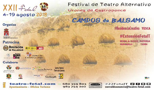 La programación del FETAL, que se celebrará del 4 al 19 de agosto en Urones de Castroponce (Valladolid) contará con 19 propuestas de teatro, danza, títeres, clown, video mapping y música. Asimismo, FETAL 2018 acogerá el encuentro «Mujeres y cultura», en el que se presentarán el proyecto «Las que habitan», creado para reconocer el trabajo de la mujer en el sector cultural en Castilla y León, y la Residencia Creativa YESCA, puesta en marcha por el festival para visibilizar la creación escénica con sello femenino. La cita terracampina, cuyo leitmotiv será Campos de bálsamo, al entenderse como un espacio de desahogo ante la realidad cotidiana, se extenderá a otras cuatro localidades vallisoletanas: Medina de Rioseco, Valdunquillo, Tiedra y Mayorga.