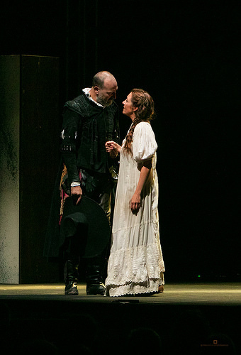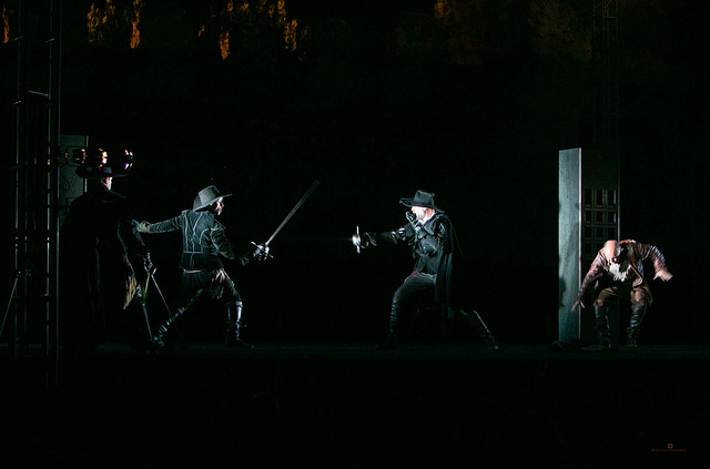 El reparto actoral, dueño del escenario, pisando con rotundidad y capturando la mirada y el oído de los que allí estábamos disfrutando de todo lo que pasaba ante nosotros. En fin, una pena que la lluvia se volviera pertinaz y no se pudiera llegar al desenlace de la obra. Pero quizá mejor así porque ver morir a “este Caballero de Olmedo” sin duda alguna nos hubiera partido el corazón.