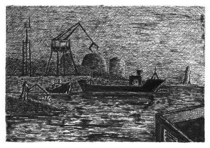 Desde la ventana de la pequeña sala veo el paisaje que he dibujado de memoria estas últimas veces: los muelles del carbón y las grandes grúas que cargan y descargan los barcos. Tras leer un poema de Elizabeth Bishop en el que una antena de radio –luces rojas que arden en silencio– emite desde la costa, hice ese dibujo nocturno que luego he repetido. Y a esta poeta la he vuelto a encontrar citada, junto con Eliot, como maestra de Jorie Graham (1950) en el Libro de los otros, comentado con precisión y traducido por Jordi Doce: anotaciones que son una hermosa biografía de las palabras justas y del asombro.