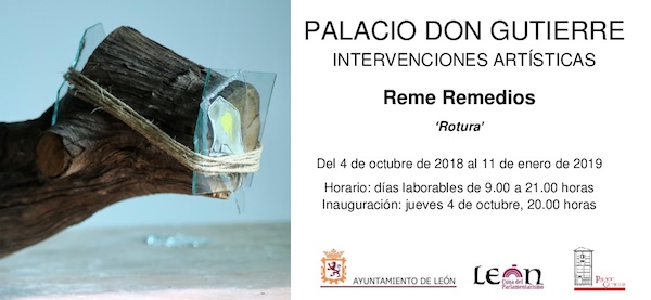 La artista, terapeuta y galerista Reme Remedios, inaugura en el Palacio Don Gutierre (León) la instalación «Proyecto rotura», pensada especialmente para este pequeño espacio expositivo, en el corazón del Barrio Húmedo leonés, y realizada durante los meses de verano por esta creadora gallega, vital y multidisciplinar, en su estudio de Corullón, en El Bierzo. La inauguración será el jueves 4 de octubre, a las 20 horas. Entrada libre.