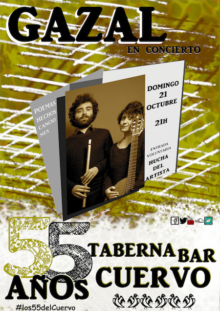 Este domingo 21 de octubre, con motivo de la celebración del 55° aniversario de la Taberna Bar Cuervo (en León), se podrá disfrutar en directo, a partir de las 21 horas y con entrada libre, de las composiciones de Gazal, dúo compuesto por Diana Trigueros e Ignacio Martínez.