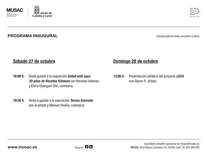 Este sábado 27 de octubre, de 17:00 a 21:00 horas, se inauguran en el MUSAC (León) tres nuevas exposiciones: la primera, una amplia retrospectiva dedicada a la pintora leonesa Teresa Gancedo; la segunda, dentro del Proyecto Vitrinas, protagonizada por el arquitecto sevillano Santiago Cirugeda y su estudio Recetas Urbanas, titulada Usted está aquí. 20 años de Recetas Urbanas y, finalmente, en el marco de la Convocatoria Laboratorio 987, se abrirá el LECA. Laboratorio de Experimentación y Creación Artística, protagonizado por el polifacético artista, músico, productor audiovisual y poeta leonés Genzo P. (nombre artístico de Iván Díez Álvarez).