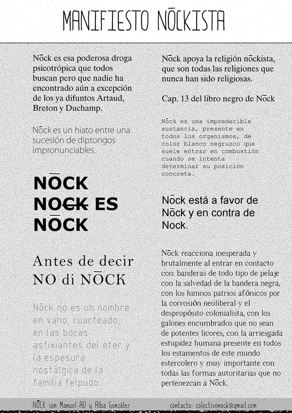 De inspiración Dadaísta, Nock es un colectivo dedicado a la gestión cultural. Impulsado por el actor y dramaturgo Manuel AO y la artista y perfromer Alba González y respaldado por la asociación UAW/MF, el colectivo Nock se fundó en 2017 con vista a gestionar el festival de polipoesía Ollagoru además de otros proyectos que necesiten de un componente gestor.