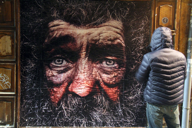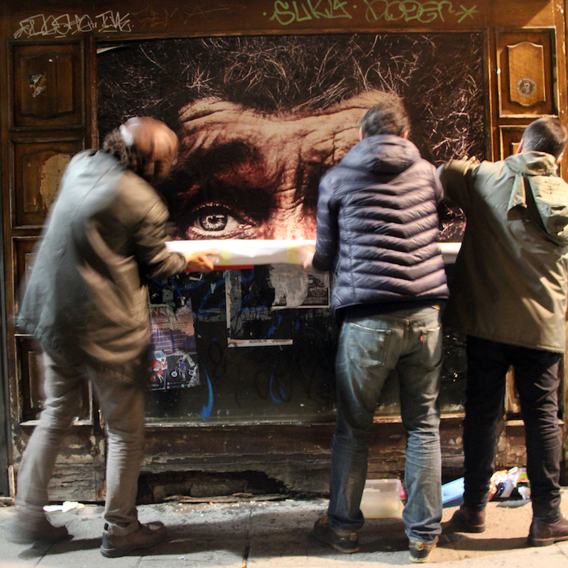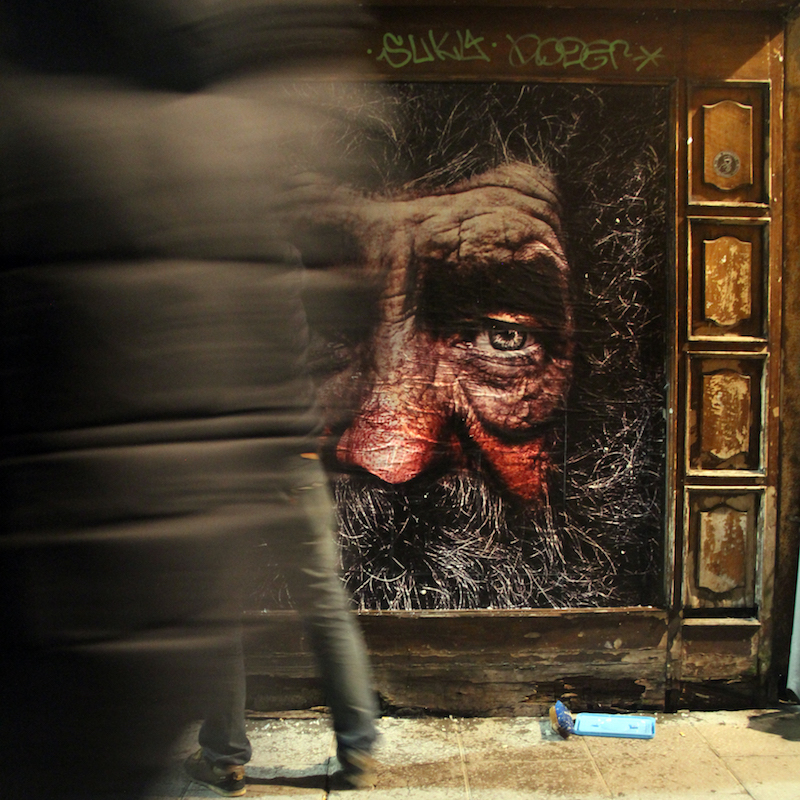 La imagen que ha colocado esta vez, impresa en folios y encolada directamente sobre los restos del escaparate, muestra el arrugado rostro de un hombre curtido por la vida que mira de frente, directamente a los ojos, cansado y sin miedo. Se trata de una imagen trabajada en el ordenador a partir de innumerables fragmentos fotográficos de distintos personajes y seres. El resultado es un primer plano a gran tamaño bastante realista e impactante.