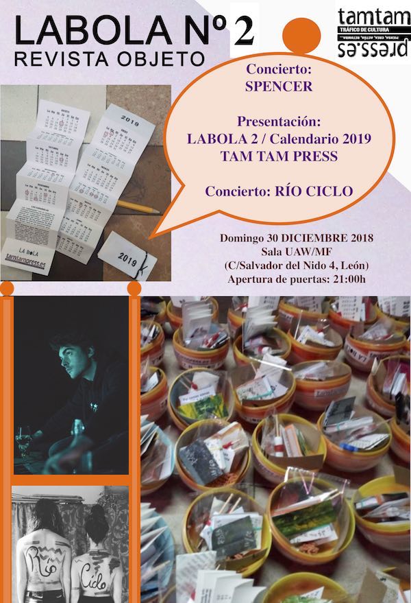 2-labola2-copia 28 de diciembre de 2018 Return to: Presentación de la revista LA BOLA 2 con el Calendario TAM TAM PRESS 2019 y sendos conciertos de Daniel Spencer y Río Ciclo en la sala UAW/MFMáxima resolución (600 × 879) Image navigation Siguiente imagen