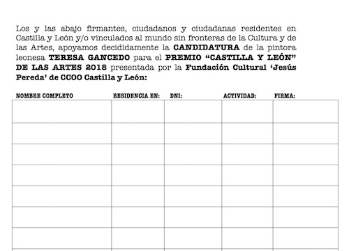 Hasta el próximo 28 de enero de 2019 se puede apoyar esta candidatura firmando físicamente en los folios dispuestos a tal efecto en la Galería Ármaga ( C/ Alfonso V, 6 – 24001 – León) y en el MUSAC. También desde TAM TAM PRESS nos sumamos a la recogida de firmas de apoyo. Así, se puede remitir la firma personalmente al correo electrónico tamtampress2012@gmail.com, indicando en el «asunto»: FIRMA TG, e incluyendo el nombre completo del firmante, lugar de residencia, DNI y actividad, con firma y rúbrica (se puede adjuntar una foto con la captura de la firma).