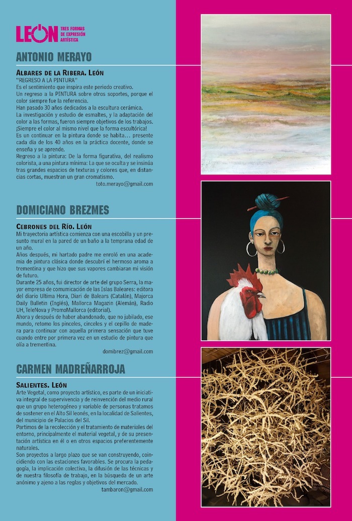 Antonio Merayo regresa a la pintura después de dedicarse 40 años a la escultura y el trabajo en cerámica; Domiciano Breznes inicia una nueva andadura como retratista tras abandonar su trabajo como director de arte en una gran empresa editorial y Carmen Madreñarroja, integrante del colectivo Arte Vegetal originario del Alto Sil Leonés, busca recuperar el tratamiento de materiales vegetales como una forma de aprovechar el arte para abrir caminos integrales de supervivencia en el medio rural.
