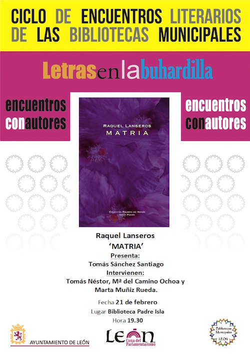 La poeta Raquel Lanseros regresa a León, la ciudad donde vivió unos años, para presentar su nuevo libro, Matria (Visor Libros). Será en la biblioteca Padre Isla, dentro del ciclo «Letras en la buhardilla», este jueves 21 de febrero, a las 19:30 horas. El poeta y novelista Tomás Sánchez Santiago la acompañará en la mesa, como presentador. Otros tres autores amigos intervendrán en el acto: Tomás Néstor, Mª del Camino Ochoa y Marta Muñiz Rueda. Entrada libre.
