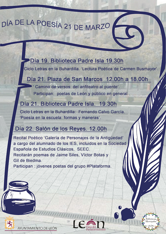 CARTEL Día Mundial de la Poesía 2019 21 de marzo de 2019 Return to: Versos, encuentros y un gran cadáver exquisito para celebrar en León el 21 de marzo, Día Mundial de la PoesíaMáxima resolución (550 × 777) Image navigation Previous Image Siguiente imagen