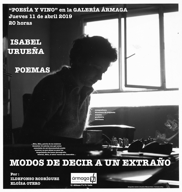 La galería leonesa Ármaga (C/Alfonso V, 6) acoge este jueves 11 de abril de 2019, a las 20 horas, con la escenografía de los dibujos del artista vasco Víctor Arrizabalaga al fondo, la quinta lectura poética del ciclo “Poesía y vino”, que quiere convertirse en un acto para recordar a la compositora y escritora leonesa Isabel Urueña, fallecida el pasado verano.