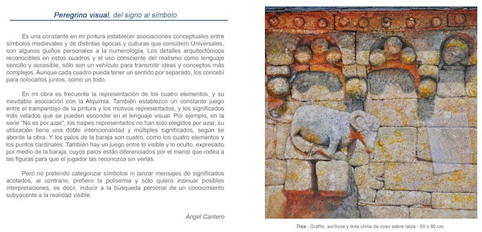 Los templos medievales están cargados de misterio, de imágenes mil veces interpretadas y, a pesar de ello, con muchos enigmas por descifrar; del mismo modo que han inspirado innumerables publicaciones literarias, también han sido un motivo de investigación para el pintor Ángel Cantero. ¿Son las marcas de cantería del románico solamente un signo lapidario tallado en cada sillar por fámulos y canteros, para dejar constancia de sus jornadas de trabajo?, ¿qué preguntas nos hacemos al conocer que algunos capiteles solamente son iluminados por los rayos del sol en los cambios de solsticio?, ¿cuál es la funcionalidad de los laberintos dibujados en el pavimento de las catedrales góticas?