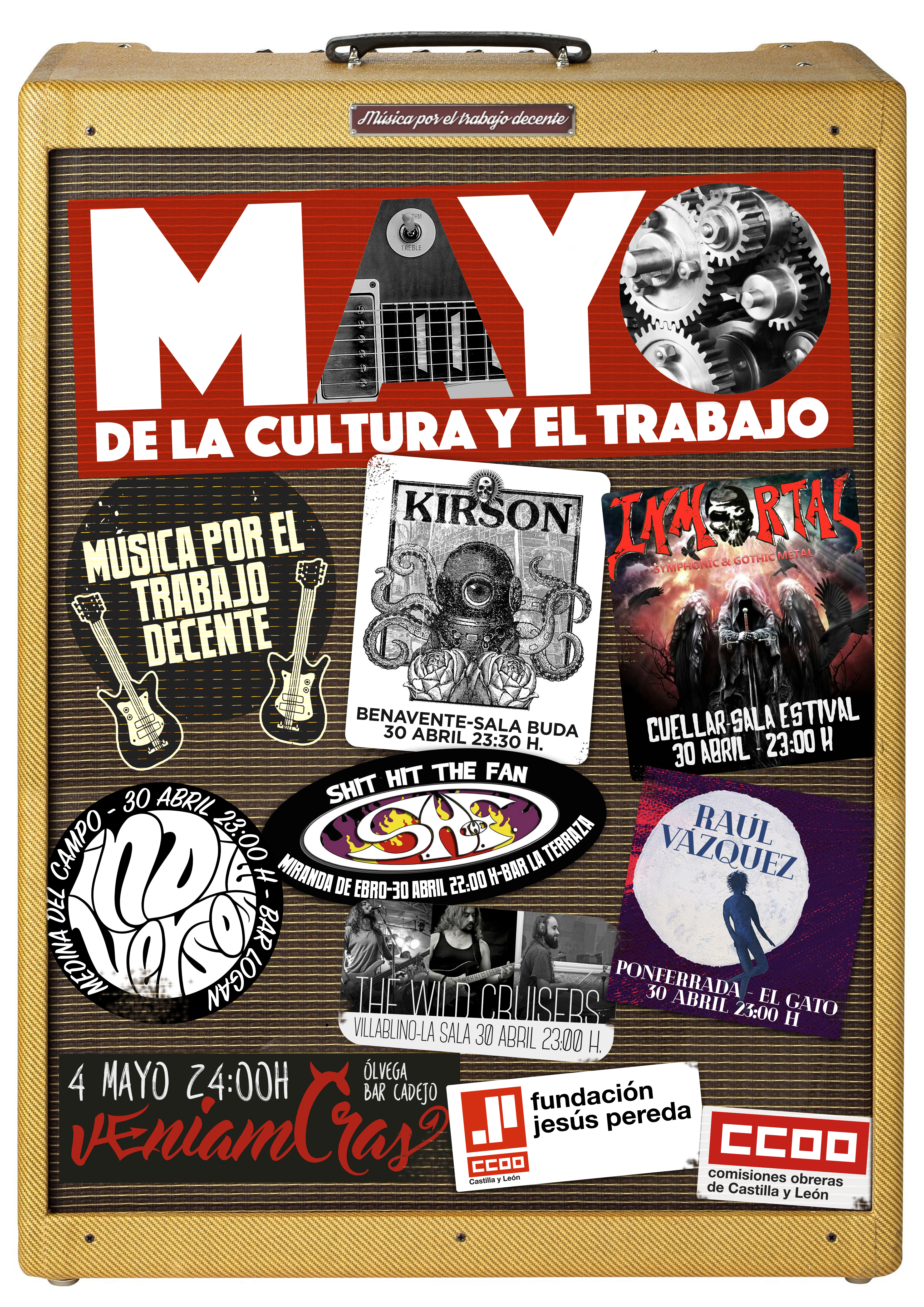Con el rótulo general MÚSICA POR EL TRABAJO DECENTE se han programado un total de siete conciertos en otras tantas localidades de Castilla y León en torno al 1º de mayo, bien en su víspera, bien en días inmediatos. Siete conciertos en los que intervienen grupos locales, cuyas actuaciones dan pie también para unir lo reivindicativo y lo festivo, que son características compartidas en el Día del Trabajo.