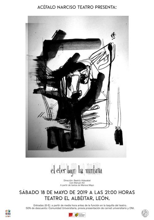 Este sábado 18 de mayo de 2019 se estrena en el teatro El Albéitar (León), en una única función, la obra «El éter bajo la montaña», de la compañía Acéfalo Narciso Teatro, un viaje hacia el interior de la mente humana desde las vivencias y experiencias de una persona diagnosticada con una afección mental. Escrita y representada por el actor y performer Manuel AO, bajo la dirección de Beatriz Aldazabal, la pieza se inspira en textos de Mareva Mayo, una de las voces más desgarradas y convulsas de la poesía leonesa. Entradas: 8 euros.