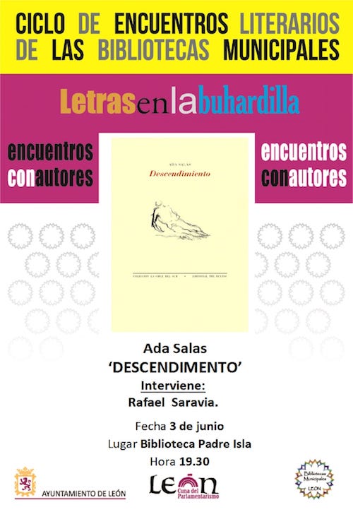 La buhardilla de la biblioteca municipal Padre Isla, en León, recibe este lunes 3 de junio a la poeta extremeña Ada Salas, que presentará su libro «Descendimiento» (Pre-textos, 2019) a partir de las 19:30 horas. Entrada libre.