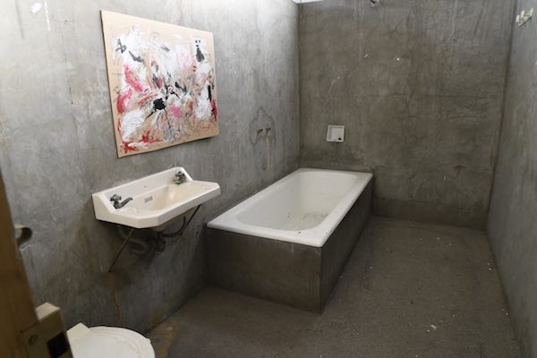 De ahí ya pasamos al vestuario de los mineros, ese espacio sobrecogedor con las perchas colgadas del techo. Aquí no hay obra, el espacio es ya una instalación en sí misma. Del vestuario de los mineros pasamos a la derecha a la zona de baños y duchas de los mineros donde toda la obra que se muestra tiene medidas comprendidas entre 190 x 300 y de 150 x 190 cm. Estas obras están relacionadas con el carbón y con motivos de épocas remotas. Animales, fósiles, pinturas casi rupestres, obras que llevan por título antracita, coque, hulla, entre otras. Al final en los cuartos de wc, la última obra que nos encontramos es una en azules que he titulado «Noche oscura del alma».