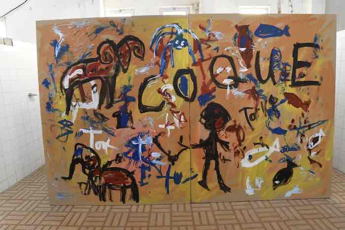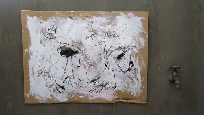 Entrando al vestuario por donde entraban los mineros (por ahí se empieza la visita) vemos colgado un cartón reciclado que muestra una especie de angelotes que quiero que marquen un poco el carácter casi sagrado del espacio. Ahí mismo se encuentra la lampistería, donde se entregaban las lámparas de carburos a los mineros. Aprovecho este espacio singular para unas pocas obras de tamaño pequeño y mediano, todas sobre cartones reciclados, de las primeras que hice.
