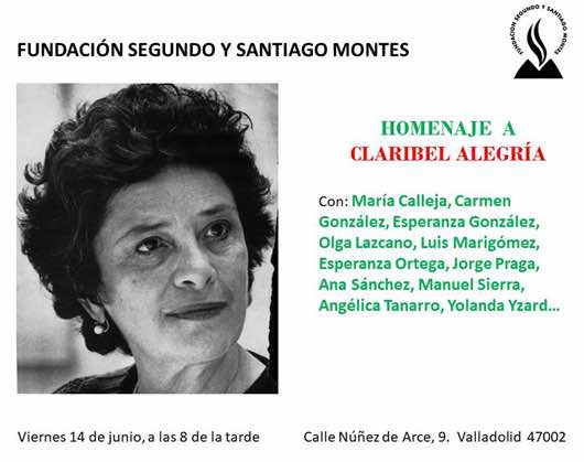 La Fundación Segundo y Santiago Montes (Valladolid) acogerá el próximo viernes 14 de junio, a las 20 horas, un Homenaje a Claribel Alegría. Participarán escritores, pintores, periodistas y personas amigas como María Calleja, Carmen González, Esperanza González, Olga Lazcano, Luis Marigómez, Esperanza Ortega, Jorge Praga, Ana Sánchez, Manuel Sierra, Angélica Tanarro, Yolanda Yzard…