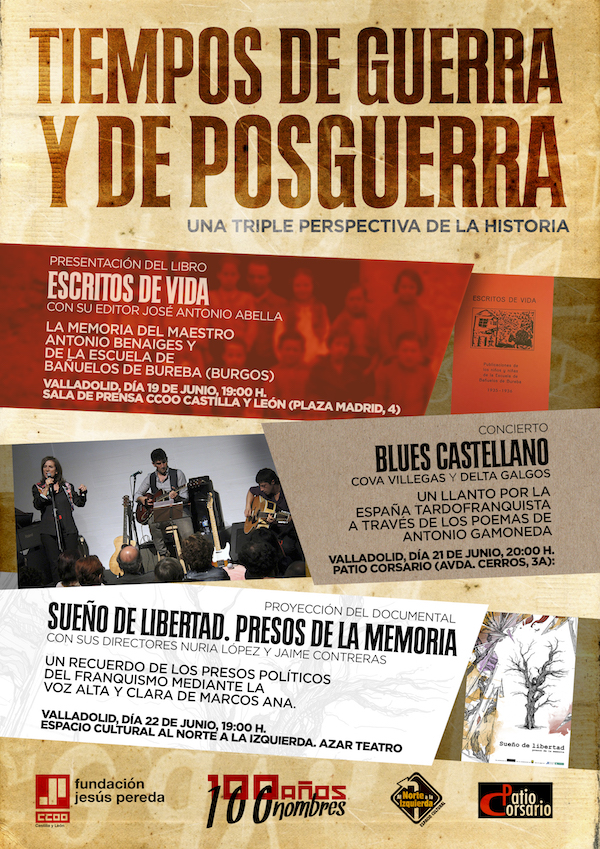 La ciudad de Valladolid acogerá, los días 19, 21 y 22 de junio, tres actividades para conmemorar el 80 aniversario del fin de la guerra civil: la presentación de un libro sobre el maestro burgalés Antonio Benaiges, un concierto de Cova Villegas y Delta Galgos con poemas musicados del libro «Blues castellano» de Antonio Gamoneda, y la proyección del documental «Sueño de libertad. Presos de la memoria» que recorre la memoria de los presos en las cárceles franquistas a partir de la voz del poeta Marcos Ana.