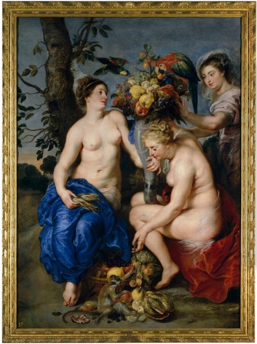 P.P. Rubens. Pese a los conflictos religiosos europeos, y como sucede con otros artistas barrocos, Rubens se valió del repertorio mitológico y del cristiano, de la iconografía de ambos y de su reflejo en la historia del arte, para lograr fructíferas e indistintas asociaciones amalgamadas en su formidable crisol compositivo y técnico. Un repertorio aventado a los cuatro puntos cardinales gracias a su prolífico taller, la difusión de sus grabados y su predicamento en las cortes europeas. En el lienzo de gran formato ‘Ceres y dos ninfas’ (1615-1617), Rubens, con la colaboración de Frans Snyders para los frutos del cuerno de la Abundancia y los animales, retoma los encargos españoles. Si hay un artista extranjero –aparte Tiziano– representado en el Museo del Prado es el pintor flamenco: no puede estudiarse su obra sin acudir al museo madrileño. Es así a causa de las veces que el pintor visitó nuestro país, pero en especial por la voracidad del rey coleccionista Felipe IV hacia sus obras, que le llevó a encargarle ambiciosas decoraciones, como la Torre de la Parada.