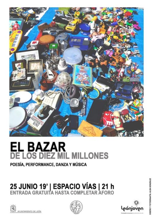 El martes 25 de junio, a las 21 horas, la compañía Acéfalo Narciso Teatro abrirá el «Bazar de los diez mil millones» en la sala de Espacio Vías (junto a la Estación de FEVE, en León). «Música, experimentación sonora, performance, poesía y danza son las secciones de este singular establecimiento. Vengan y revuelvan en el montón», animan los teatreros… Entrada gratuita hasta completar aforo. (El espectáculo forma parte de la programación oficial de las Fiestas de San Juan y Pedro 2019)